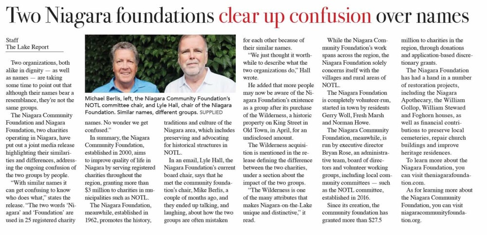 In Niagara-on-the-Lake two respected charities often get mistaken to be the same organization--The Niagara Foundation and Niagara Community Foundation. Let’s take a look at their differences.